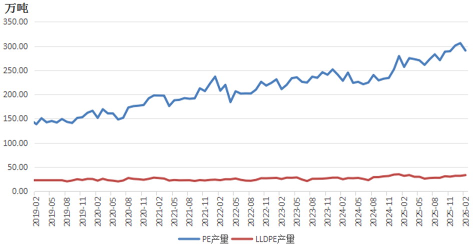 图为2019—2025年国内PE和LLDPE月度产量走势
